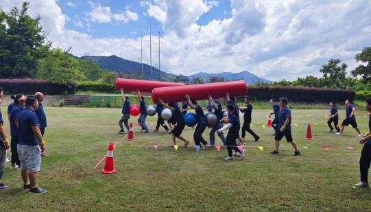生活需要儀式感,工作需要?dú)w屬感,在教練的組織安排下,分別組成6支隊(duì)伍,分別完成昂首挺胸、協(xié)力競走、開心麻花、十拿九穩(wěn)、移花接木、打地鼠等一系列活動(dòng)。