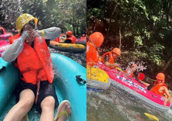 小伙伴們乘著皮艇順流而下,穿梭在蜿蜒流動(dòng)的河溪中,四面青山環(huán)繞,漂流其間,迎面而來的涼風(fēng)和水珠沖刷掉了夏日的酷熱。
