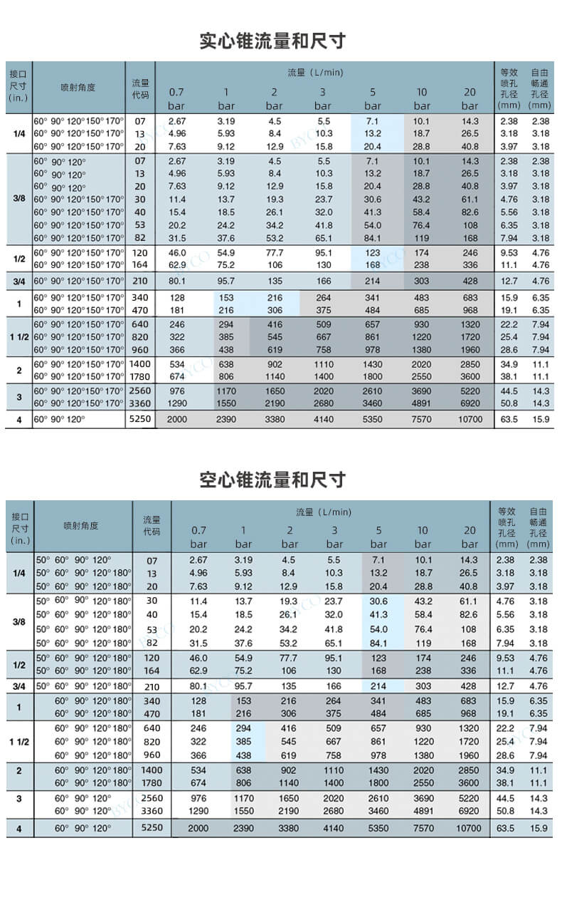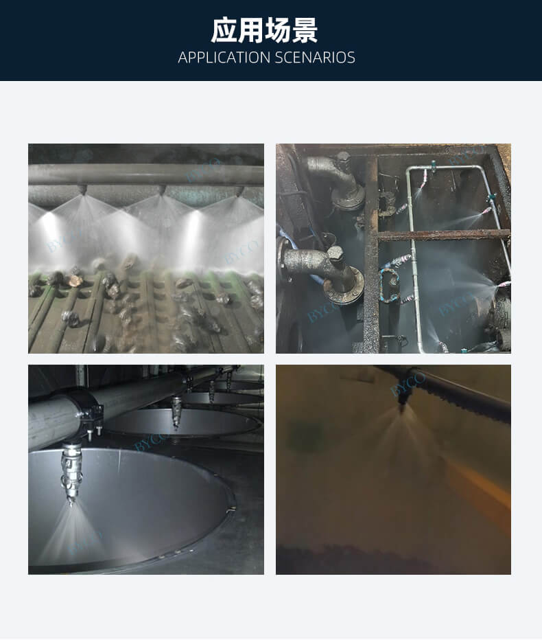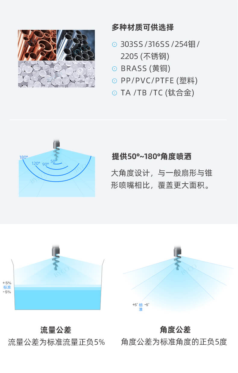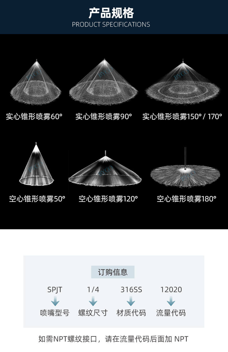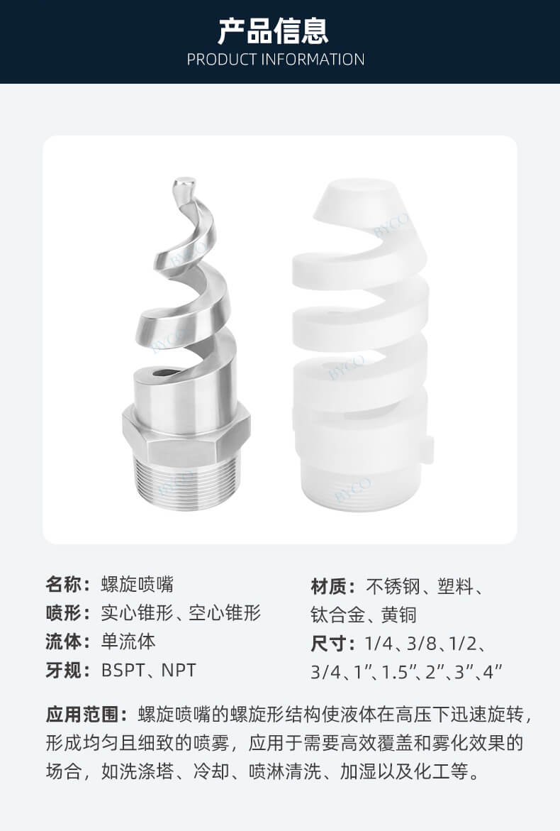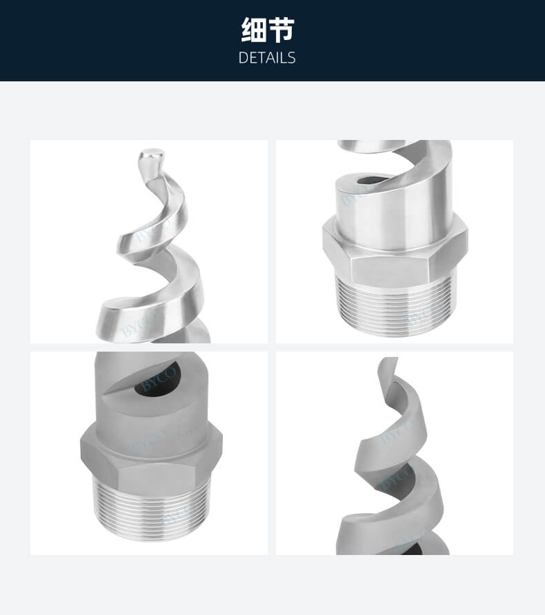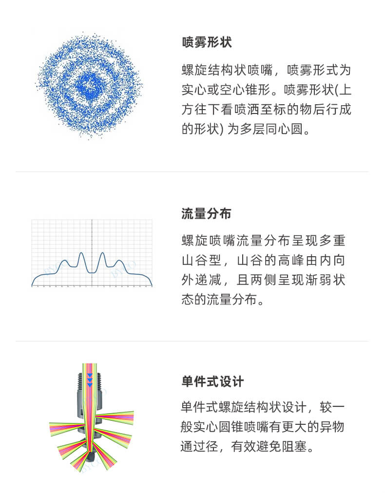 內部為大流量通道設計,最大程度地減少液體阻塞。螺旋噴嘴產生實心(空心)錐形噴霧,液滴相對較為粗糙。