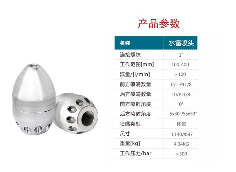 螺紋接口:1寸內牙,或者訂做噴嘴接口尺寸,重量10.3KG,適用管徑:300-1200MM,主要適用于清洗管道中及管底的沉淀物(如:沙子 碎石 污垢等,) 適用于噴頭需要強大的推進力的管道,噴頭材質為特種不銹鋼材質,噴嘴可更換。